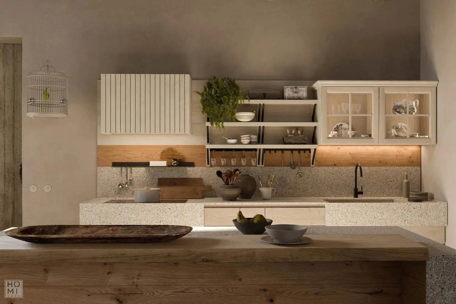 Una cucina in stile Country Moderno si adatta a un ambiente che unisce elementi rustici e contemporanei, come un open space con pavimenti in legno o pietra naturale. Pareti in tonalità neutre esaltano i dettagli in legno, mentre accessori in metallo e tessuti naturali completano l’atmosfera. L’illuminazione, con lampade a sospensione e faretti, insieme a dettagli architettonici come travi a vista, aggiunge carattere e autenticità, creando uno spazio accogliente e sofisticato.
