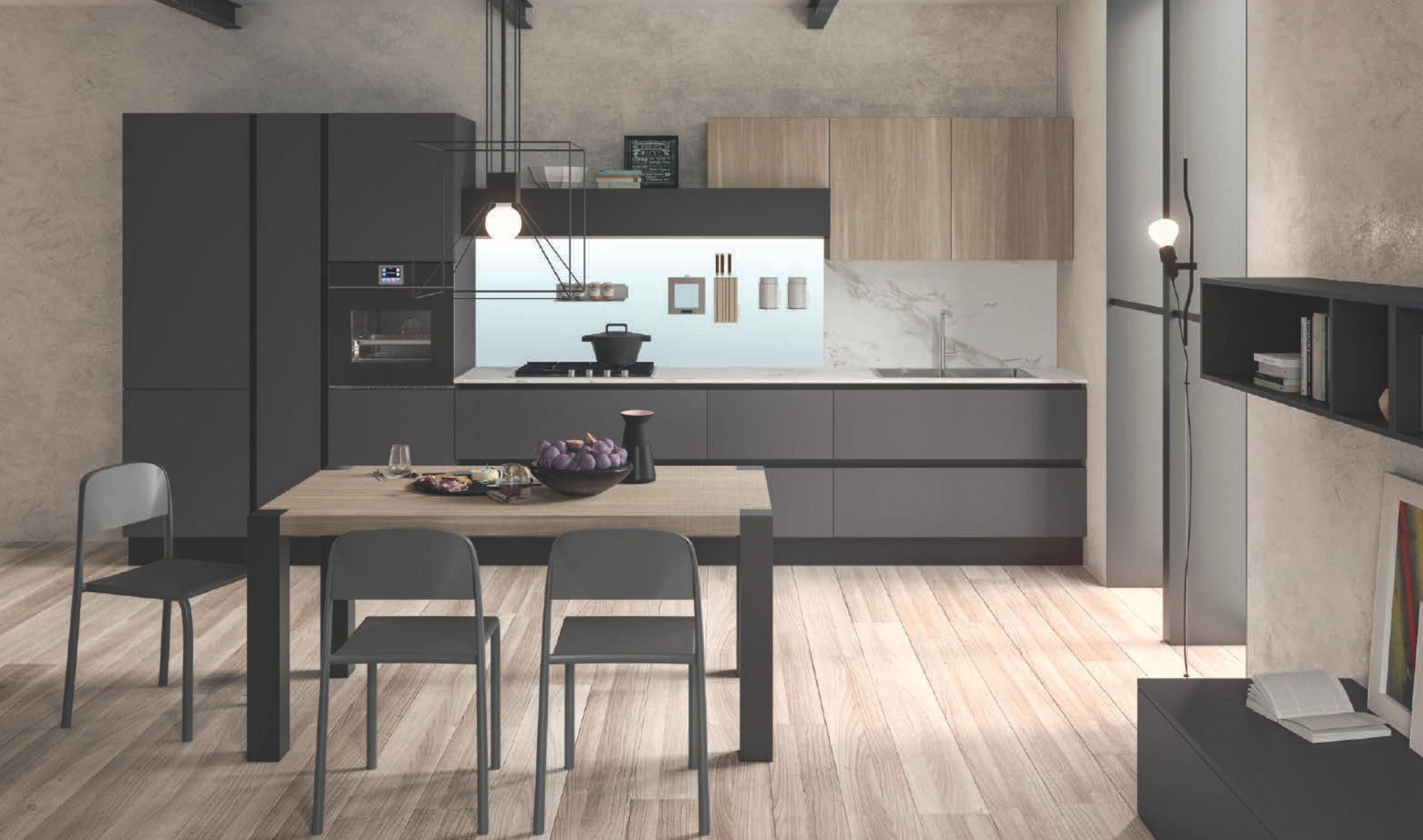 Cucina moderna senza maniglia lineare con una zona living, Erika di Aran composizione di mt. 4.50 in robusto LPL colore ombra abbinato al legno di rovere brugès. Erika un sistema di arredo versatile dal design raffinato ed elegante, tutta l’eccellenza del Made in Italy.