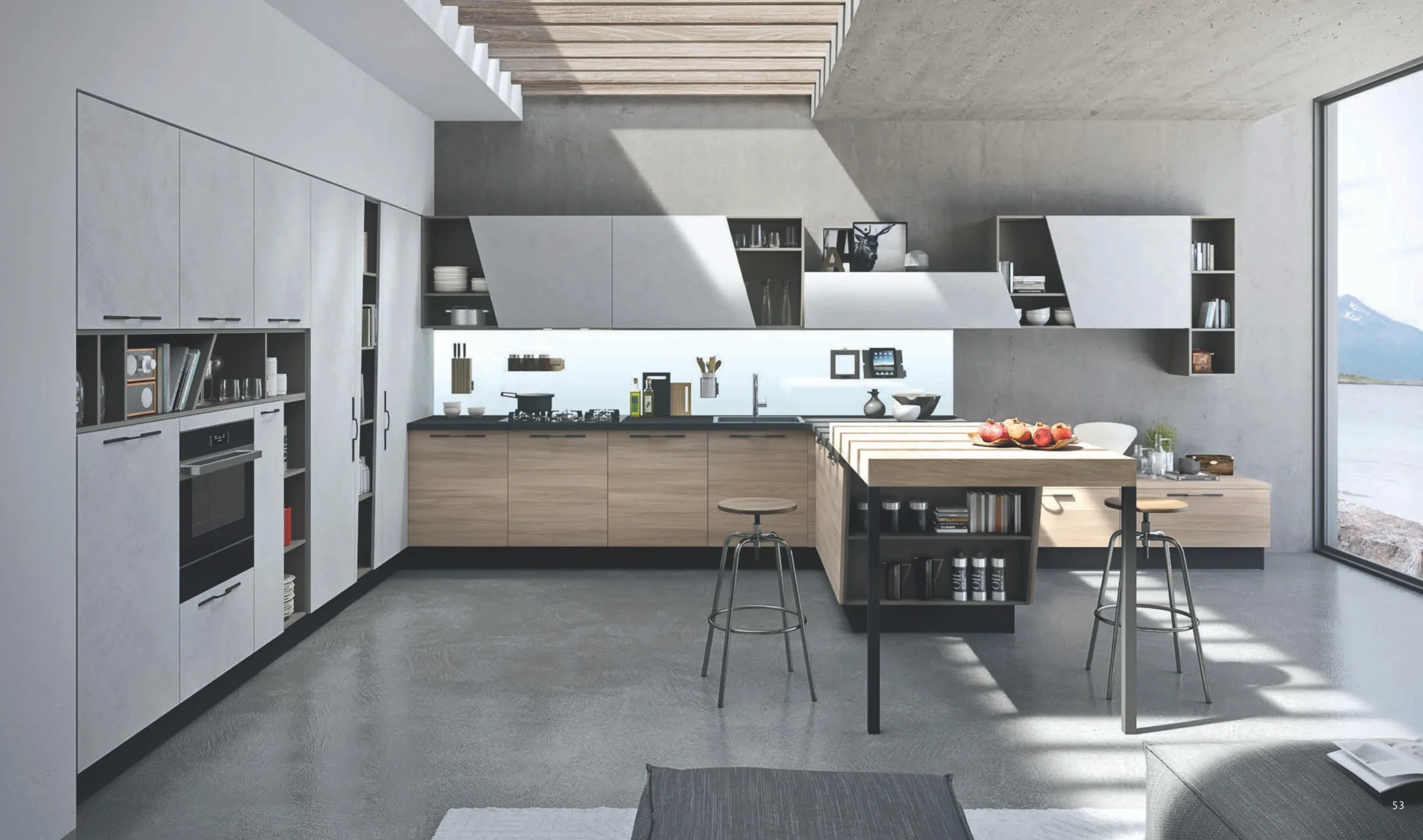 linee oblique rompono l’ordine delle basi e dei pensili creando un vivace contrasto con i piani orizzontali. Mia di Aran Cucine Cucina moderna ad angolo mt. 3.60 x mt. 4.20 in LPL Olmo Tafira, i pensili Shade Portland è una cucina fresca, giovane, una soluzione capace di incontrare gusti ed esigenze diverse senza trascurare bellezza e design.