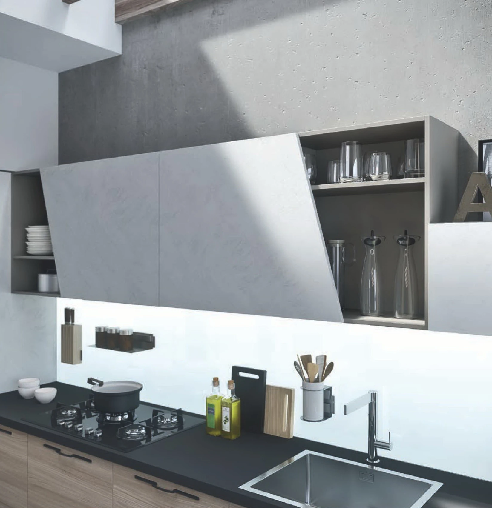 Una vastissima gamma di finiture e dettagli completa una proposta progettuale già molto ampia: dalle ante lisce e lineari disponibili con maniglia, con gola o con apertura push pull, allo schienale retroilluminato Magnetolab, passando per diversi materiali: vetro, laminati colorati, legno e superfici dall’effetto materico.